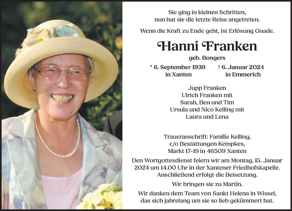 Hier finden Sie alle Traueranzeigen aus der Zeitung, die bisher für Hanni Franken erschienen sind. Weitere Traueranzeigen, die in der Zeitung erscheinen, werden hier ebenfalls aufgelistet