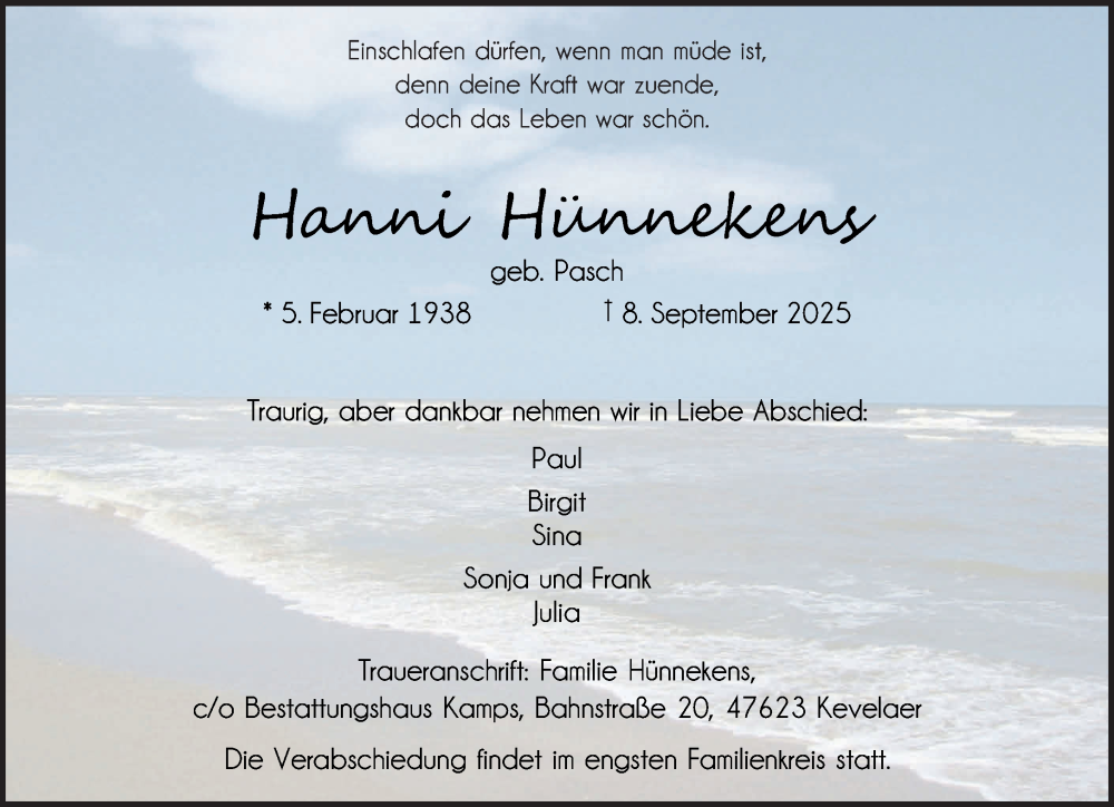 Hier finden Sie alle Traueranzeigen aus der Zeitung, die bisher für Hanni Hünnekens erschienen sind. Weitere Traueranzeigen, die in der Zeitung erscheinen, werden hier ebenfalls aufgelistet