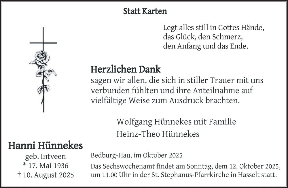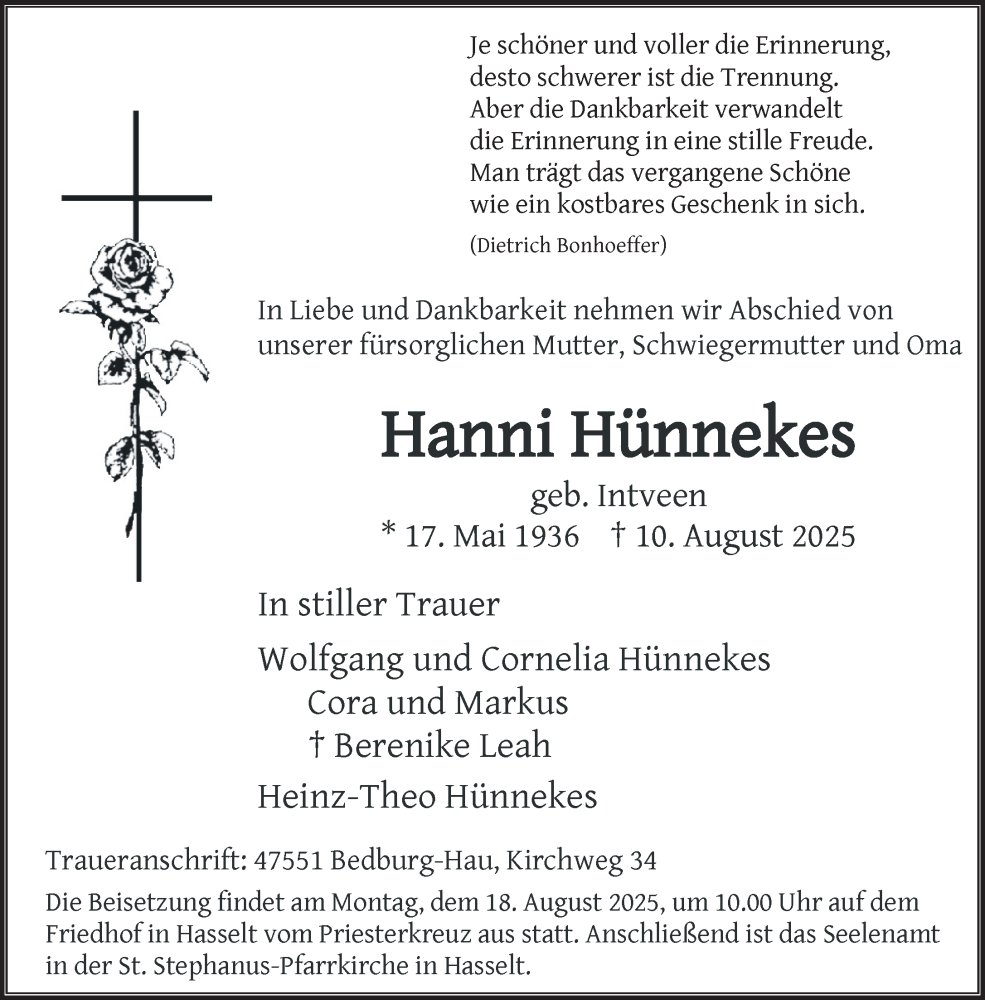 Hier finden Sie alle Traueranzeigen aus der Zeitung, die bisher für Hanni Hünnekes erschienen sind. Weitere Traueranzeigen, die in der Zeitung erscheinen, werden hier ebenfalls aufgelistet