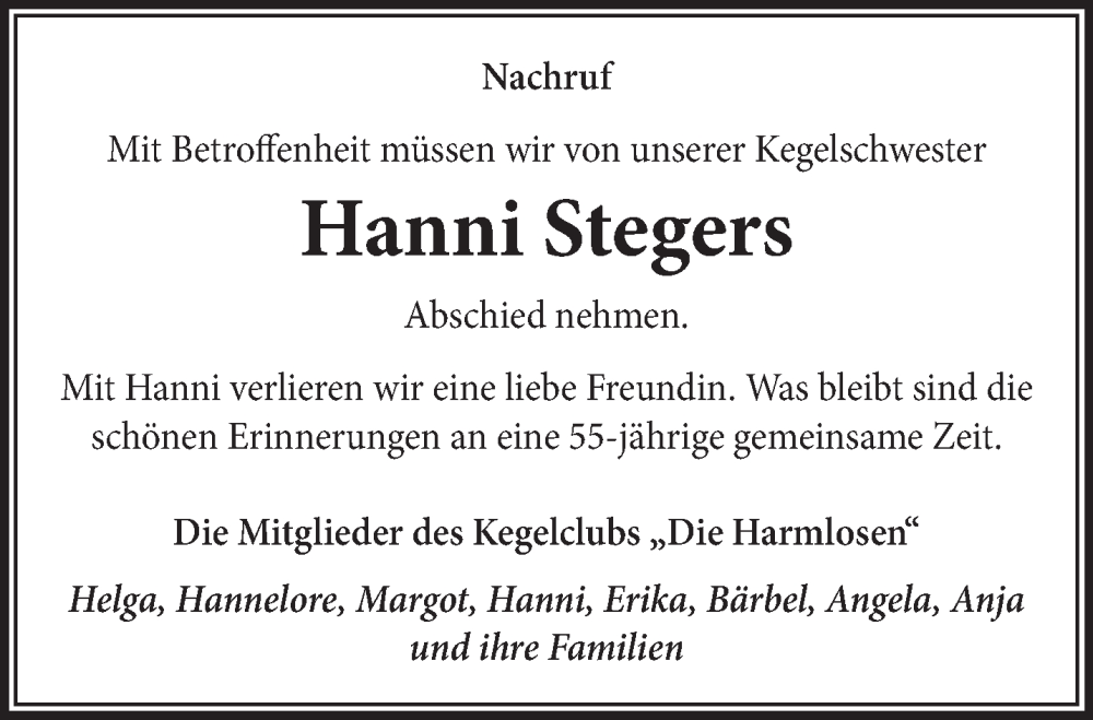 Hier finden Sie alle Traueranzeigen aus der Zeitung, die bisher für Hanni Stegers erschienen sind. Weitere Traueranzeigen, die in der Zeitung erscheinen, werden hier ebenfalls aufgelistet