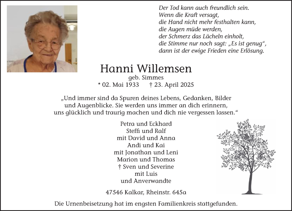 Hier finden Sie alle Traueranzeigen aus der Zeitung, die bisher für Hanni Willemsen erschienen sind. Weitere Traueranzeigen, die in der Zeitung erscheinen, werden hier ebenfalls aufgelistet