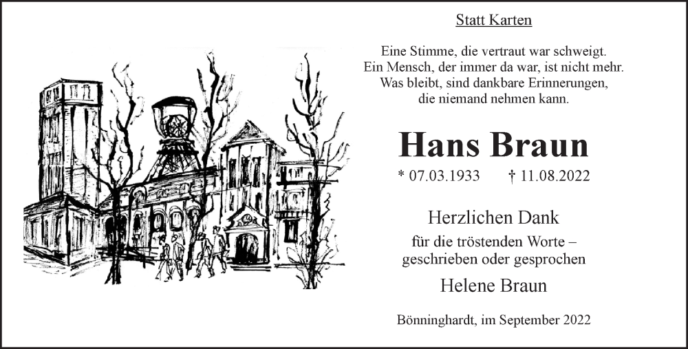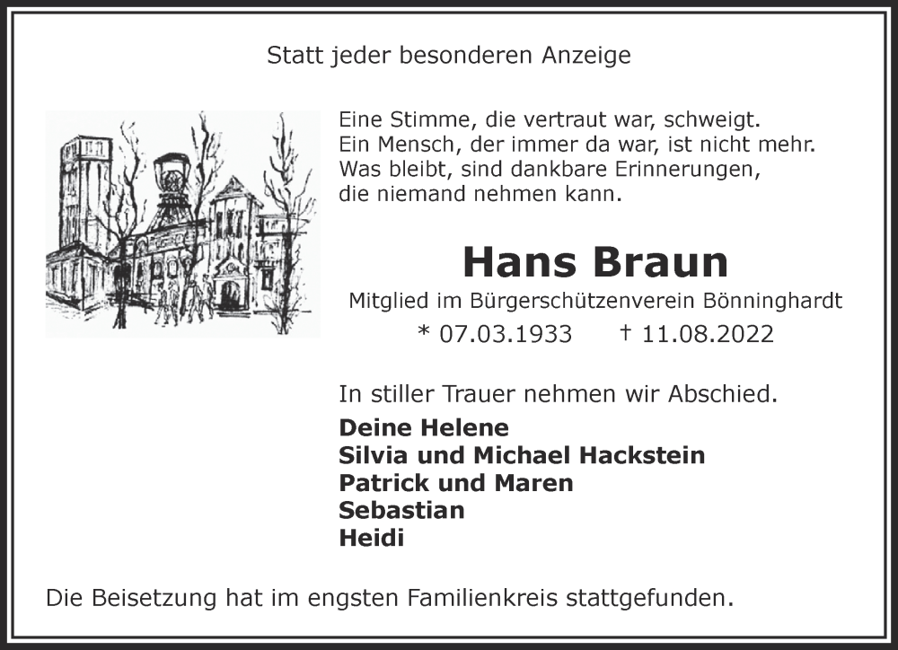 Hier finden Sie alle Traueranzeigen aus der Zeitung, die bisher für Hans Braun erschienen sind. Weitere Traueranzeigen, die in der Zeitung erscheinen, werden hier ebenfalls aufgelistet