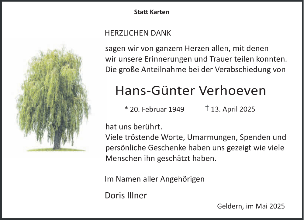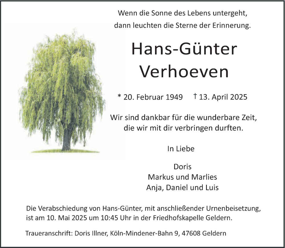 Hier finden Sie alle Traueranzeigen aus der Zeitung, die bisher für Hans-Günter Verhoeven erschienen sind. Weitere Traueranzeigen, die in der Zeitung erscheinen, werden hier ebenfalls aufgelistet