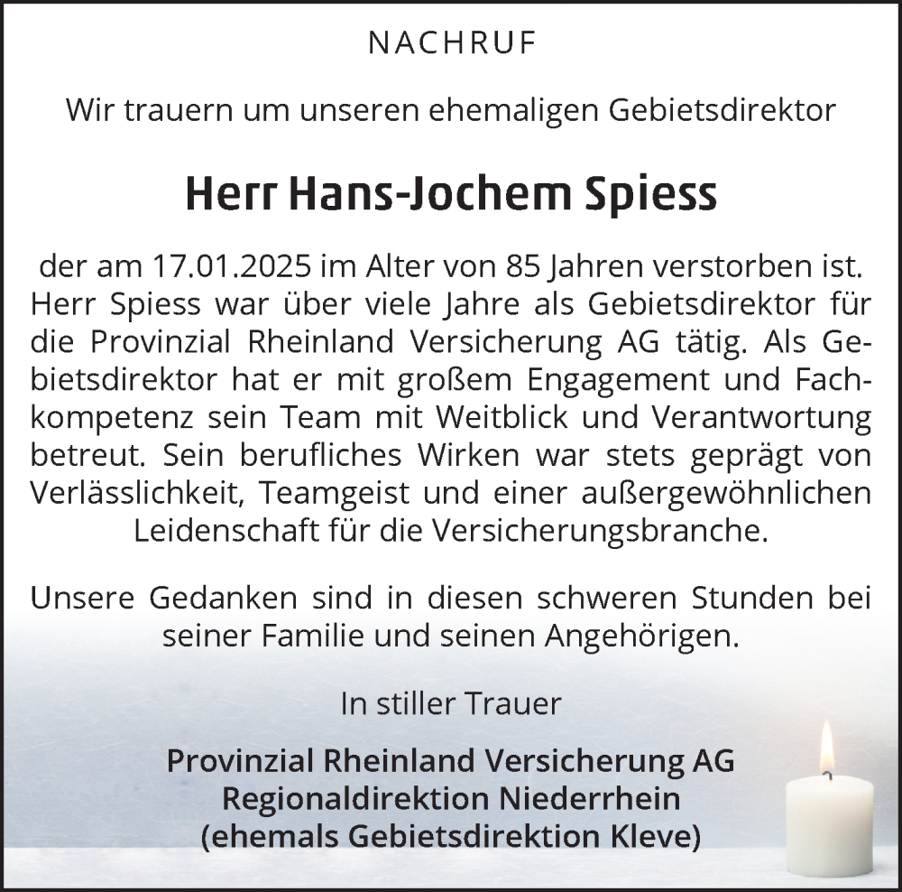 Hier finden Sie alle Traueranzeigen aus der Zeitung, die bisher für Hans-Jochem Spiess erschienen sind. Weitere Traueranzeigen, die in der Zeitung erscheinen, werden hier ebenfalls aufgelistet