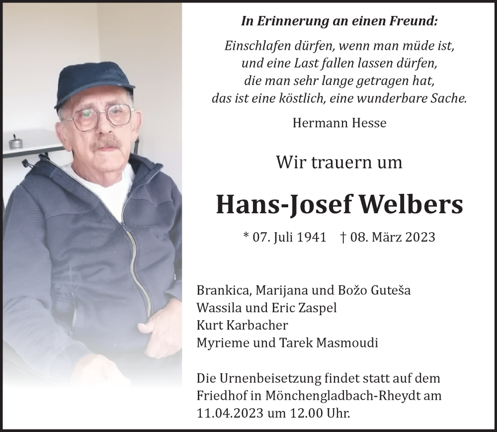 Hier finden Sie alle Traueranzeigen aus der Zeitung, die bisher für Hans-Josef Welbers erschienen sind. Weitere Traueranzeigen, die in der Zeitung erscheinen, werden hier ebenfalls aufgelistet