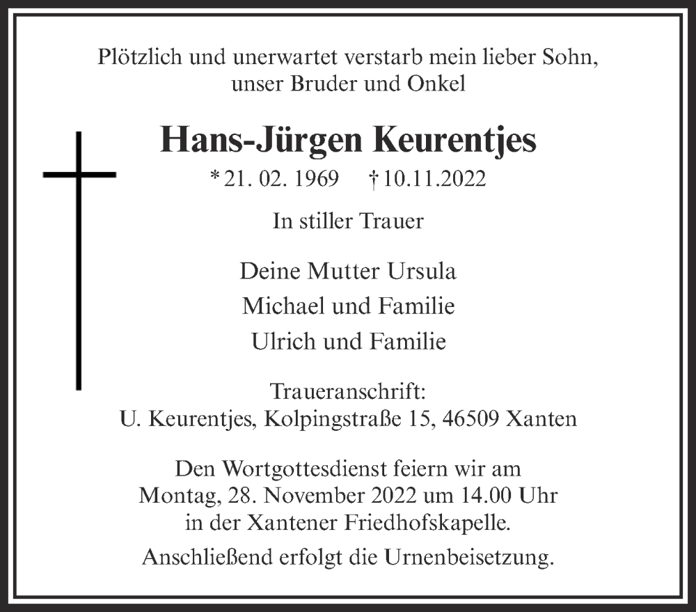 Hier finden Sie alle Traueranzeigen aus der Zeitung, die bisher für Hans-Jürgen Keurentjes erschienen sind. Weitere Traueranzeigen, die in der Zeitung erscheinen, werden hier ebenfalls aufgelistet
