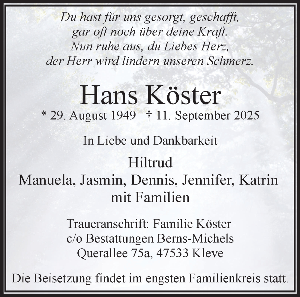Hier finden Sie alle Traueranzeigen aus der Zeitung, die bisher für Hans Köster erschienen sind. Weitere Traueranzeigen, die in der Zeitung erscheinen, werden hier ebenfalls aufgelistet