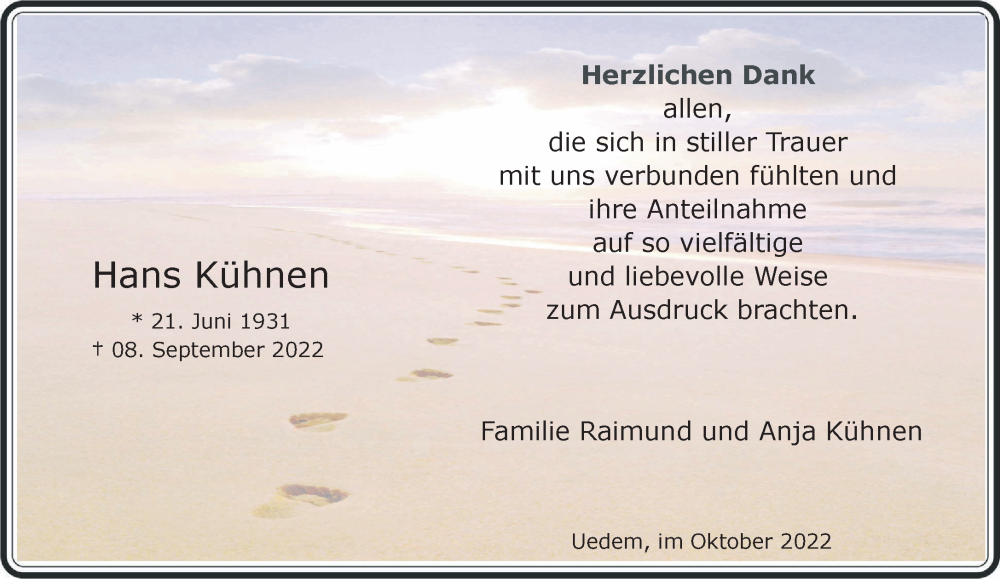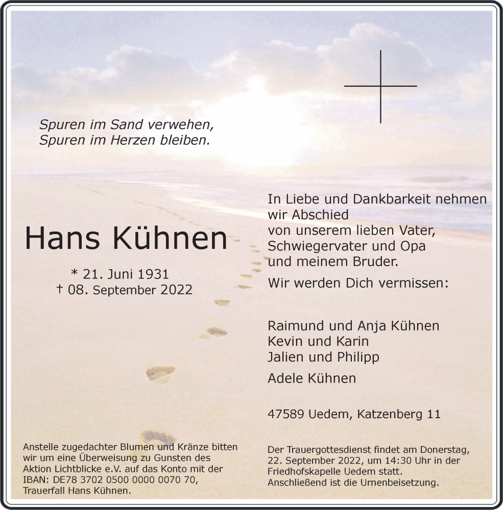 Hier finden Sie alle Traueranzeigen aus der Zeitung, die bisher für Hans Kühnen erschienen sind. Weitere Traueranzeigen, die in der Zeitung erscheinen, werden hier ebenfalls aufgelistet