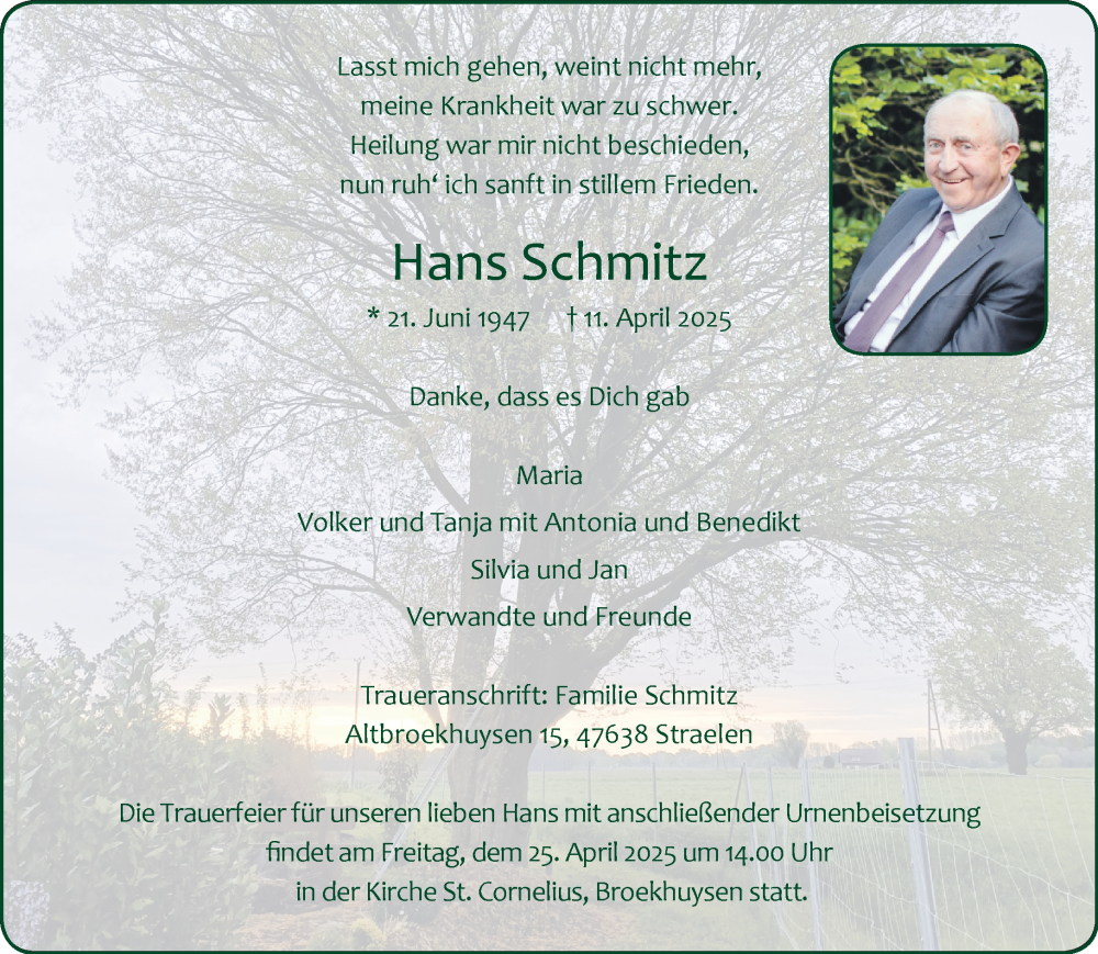 Hier finden Sie alle Traueranzeigen aus der Zeitung, die bisher für Hans Schmitz erschienen sind. Weitere Traueranzeigen, die in der Zeitung erscheinen, werden hier ebenfalls aufgelistet