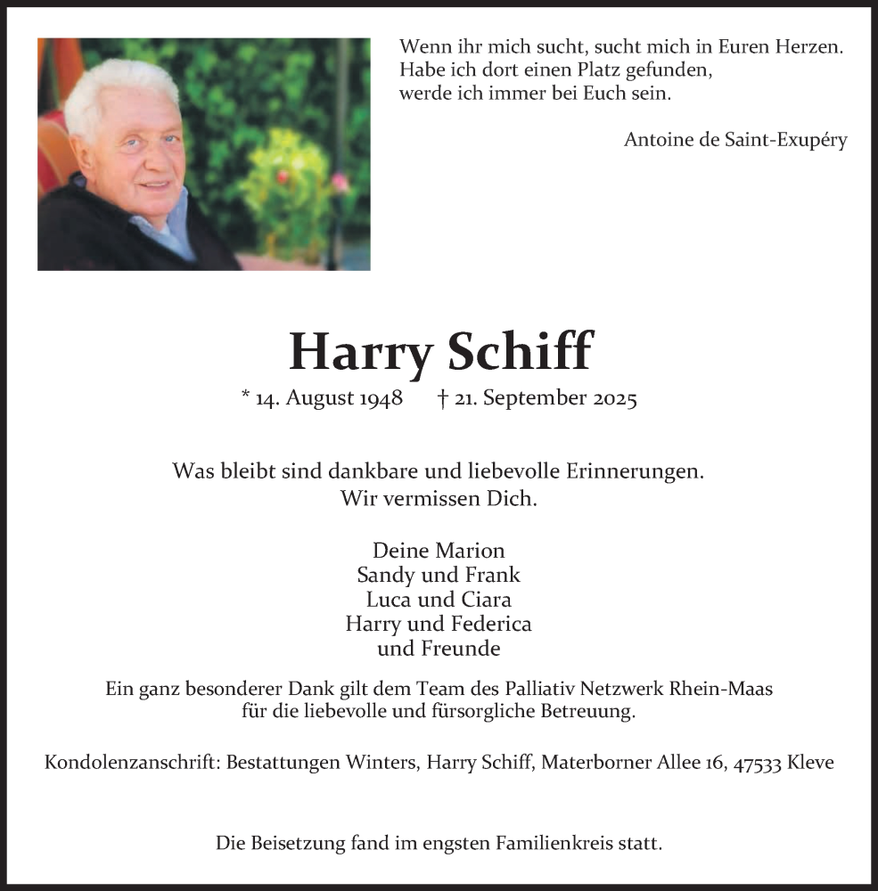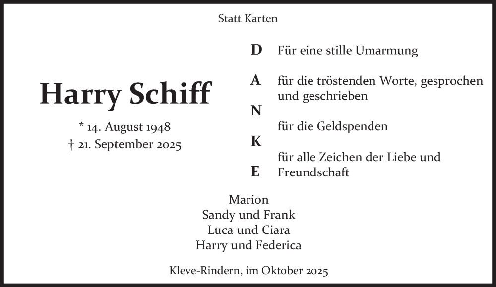 Hier finden Sie alle Traueranzeigen aus der Zeitung, die bisher für Harry Schiff erschienen sind. Weitere Traueranzeigen, die in der Zeitung erscheinen, werden hier ebenfalls aufgelistet