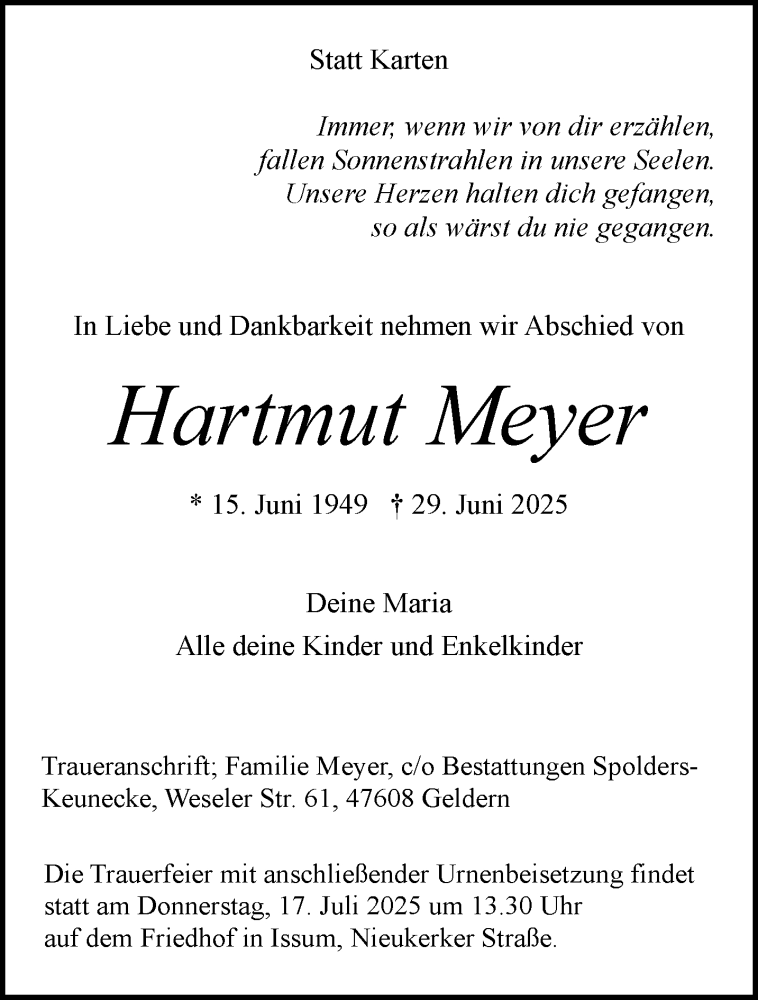 Hier finden Sie alle Traueranzeigen aus der Zeitung, die bisher für Hartmut Meyer erschienen sind. Weitere Traueranzeigen, die in der Zeitung erscheinen, werden hier ebenfalls aufgelistet