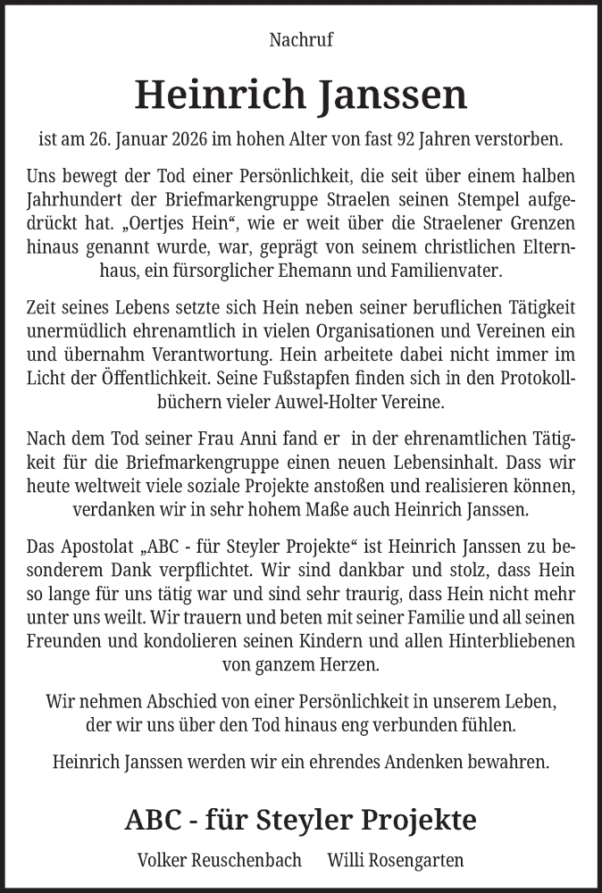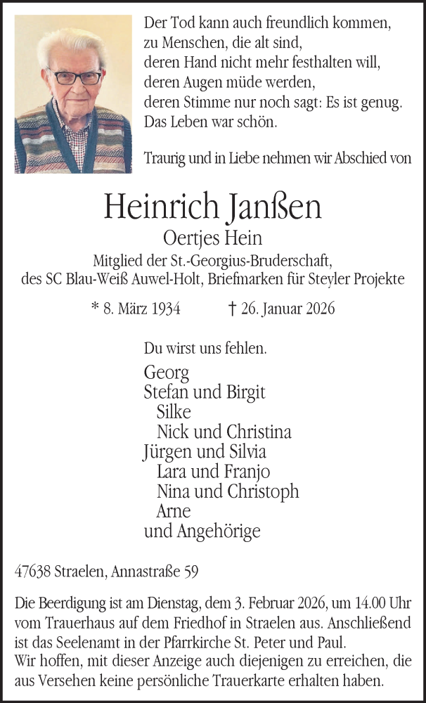 Hier finden Sie alle Traueranzeigen aus der Zeitung, die bisher für Heinrich Janssen erschienen sind. Weitere Traueranzeigen, die in der Zeitung erscheinen, werden hier ebenfalls aufgelistet