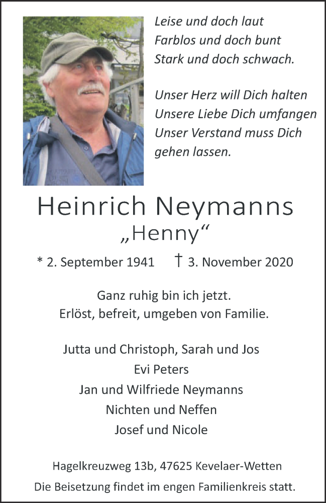 Hier finden Sie alle Traueranzeigen aus der Zeitung, die bisher für Heinrich Neymanns erschienen sind. Weitere Traueranzeigen, die in der Zeitung erscheinen, werden hier ebenfalls aufgelistet