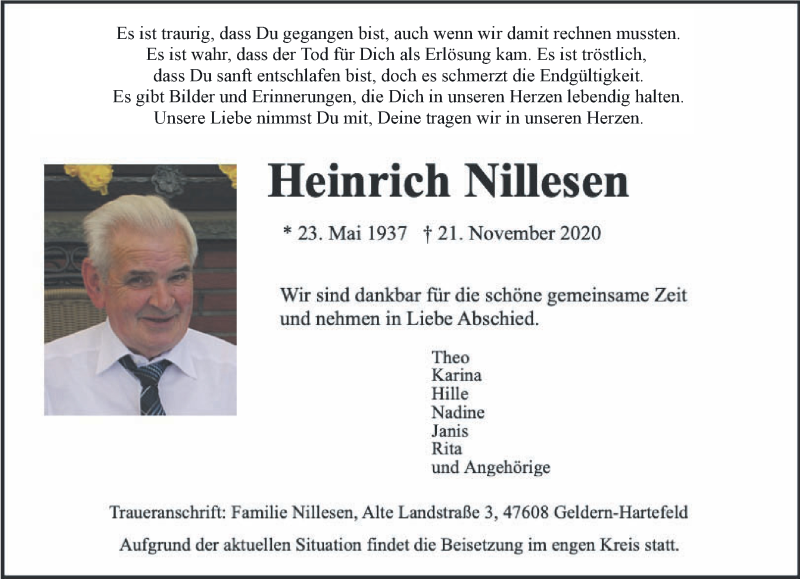 Hier finden Sie alle Traueranzeigen aus der Zeitung, die bisher für Heinrich Nillesen erschienen sind. Weitere Traueranzeigen, die in der Zeitung erscheinen, werden hier ebenfalls aufgelistet