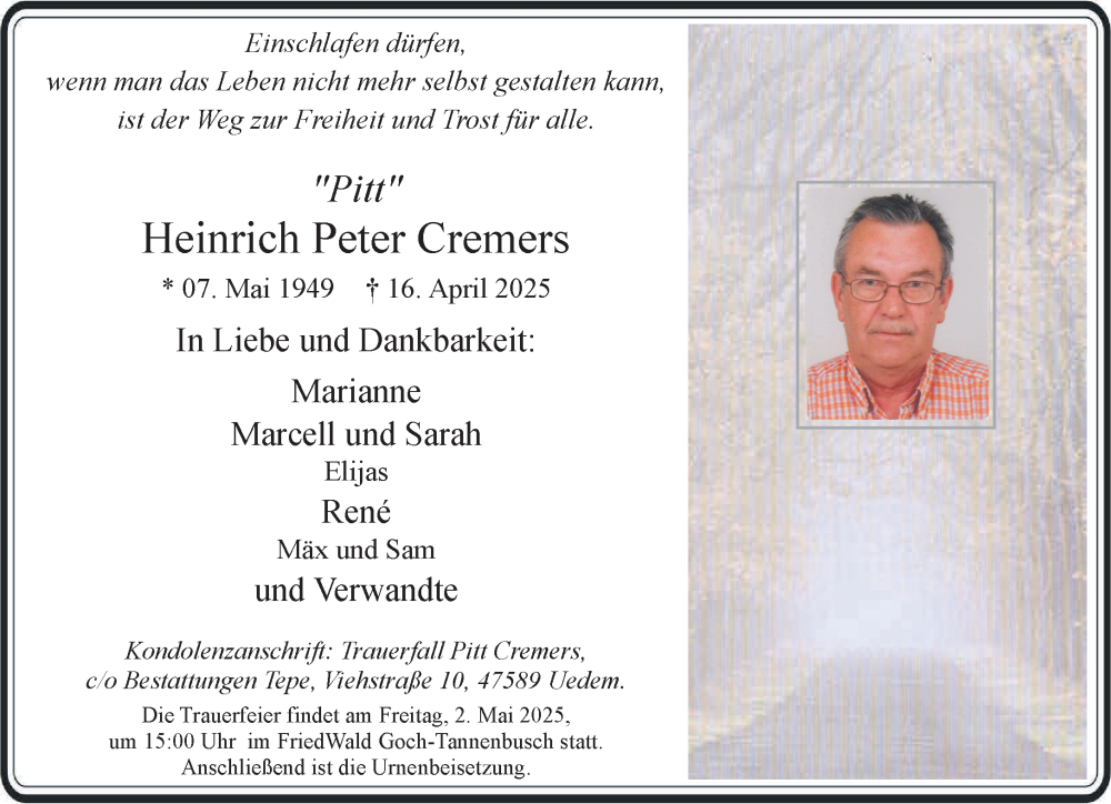Hier finden Sie alle Traueranzeigen aus der Zeitung, die bisher für Heinrich Peter Cremers erschienen sind. Weitere Traueranzeigen, die in der Zeitung erscheinen, werden hier ebenfalls aufgelistet
