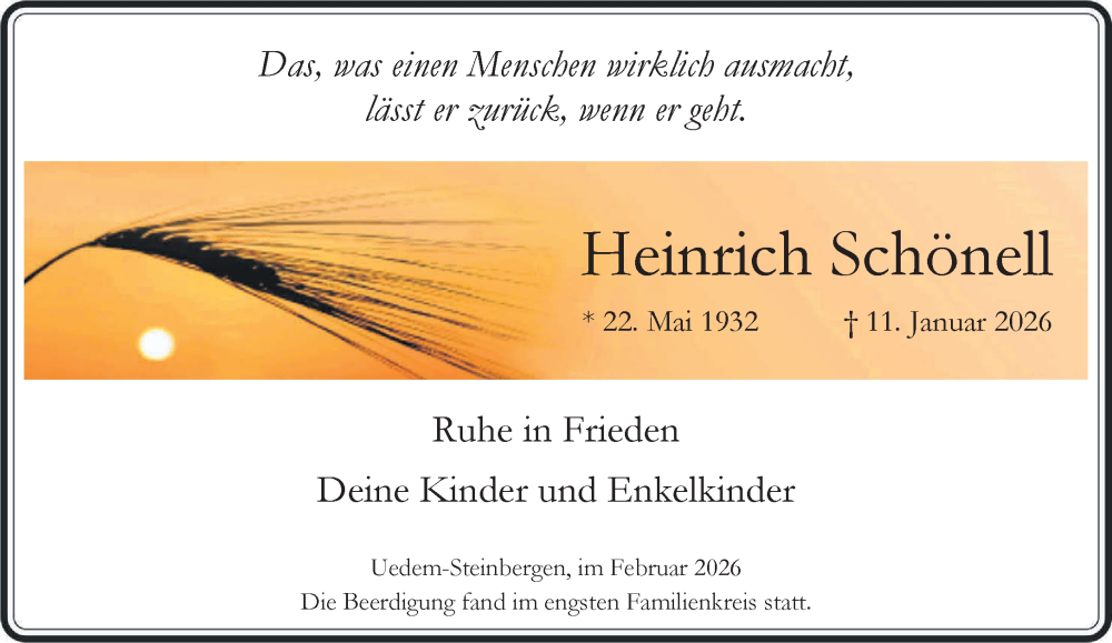 Hier finden Sie alle Traueranzeigen aus der Zeitung, die bisher für Heinrich Schönell erschienen sind. Weitere Traueranzeigen, die in der Zeitung erscheinen, werden hier ebenfalls aufgelistet