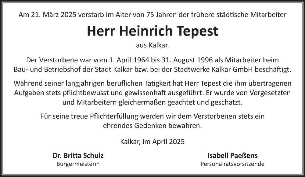Hier finden Sie alle Traueranzeigen aus der Zeitung, die bisher für Heinrich Tepest erschienen sind. Weitere Traueranzeigen, die in der Zeitung erscheinen, werden hier ebenfalls aufgelistet