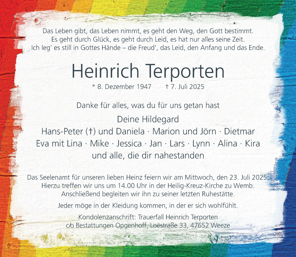 Hier finden Sie alle Traueranzeigen aus der Zeitung, die bisher für Heinrich Terporten erschienen sind. Weitere Traueranzeigen, die in der Zeitung erscheinen, werden hier ebenfalls aufgelistet