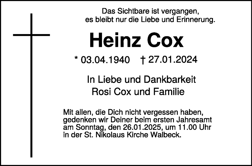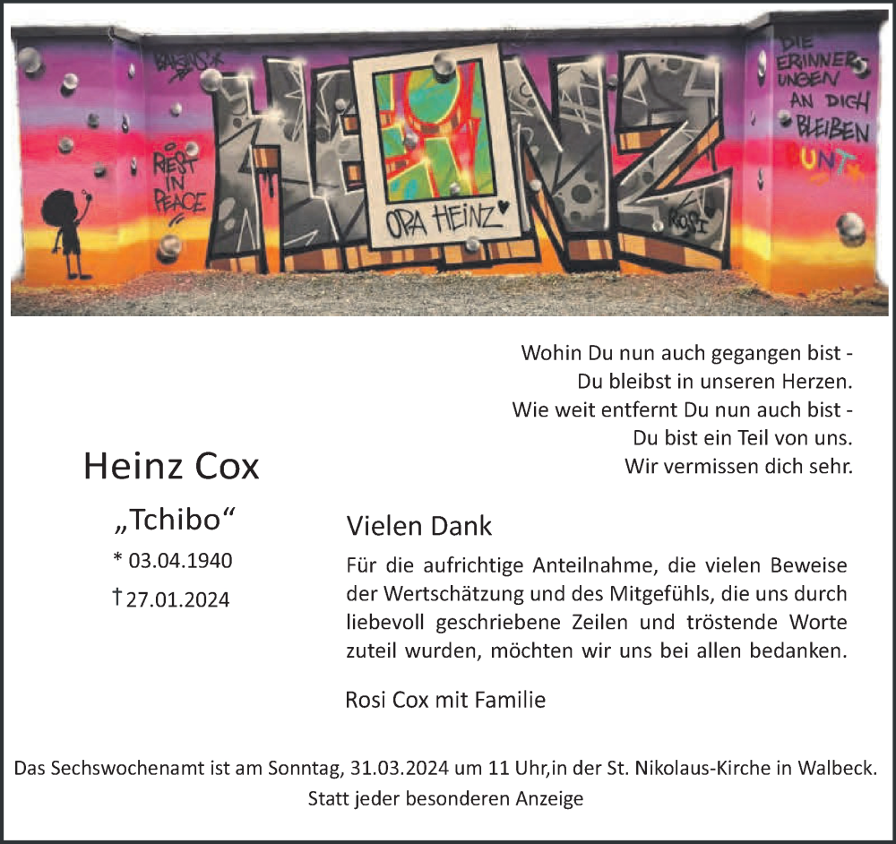 Hier finden Sie alle Traueranzeigen aus der Zeitung, die bisher für Heinz Cox erschienen sind. Weitere Traueranzeigen, die in der Zeitung erscheinen, werden hier ebenfalls aufgelistet