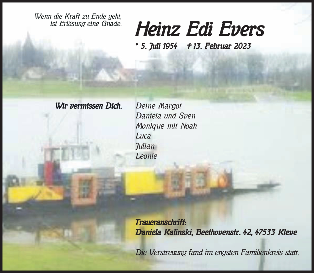 Hier finden Sie alle Traueranzeigen aus der Zeitung, die bisher für Heinz Edi Evers erschienen sind. Weitere Traueranzeigen, die in der Zeitung erscheinen, werden hier ebenfalls aufgelistet