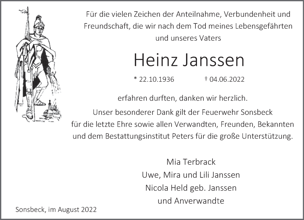 Hier finden Sie alle Traueranzeigen aus der Zeitung, die bisher für Heinz Janssen erschienen sind. Weitere Traueranzeigen, die in der Zeitung erscheinen, werden hier ebenfalls aufgelistet