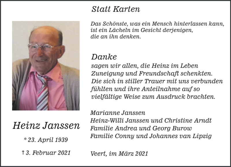Hier finden Sie alle Traueranzeigen aus der Zeitung, die bisher für Heinz Janssen erschienen sind. Weitere Traueranzeigen, die in der Zeitung erscheinen, werden hier ebenfalls aufgelistet