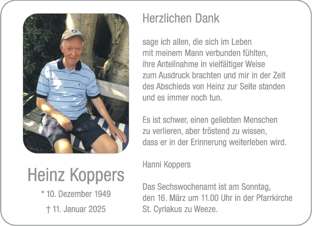 Hier finden Sie alle Traueranzeigen aus der Zeitung, die bisher für Heinz Koppers erschienen sind. Weitere Traueranzeigen, die in der Zeitung erscheinen, werden hier ebenfalls aufgelistet
