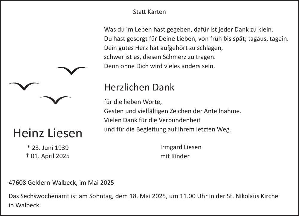 Hier finden Sie alle Traueranzeigen aus der Zeitung, die bisher für Heinz Liesen erschienen sind. Weitere Traueranzeigen, die in der Zeitung erscheinen, werden hier ebenfalls aufgelistet