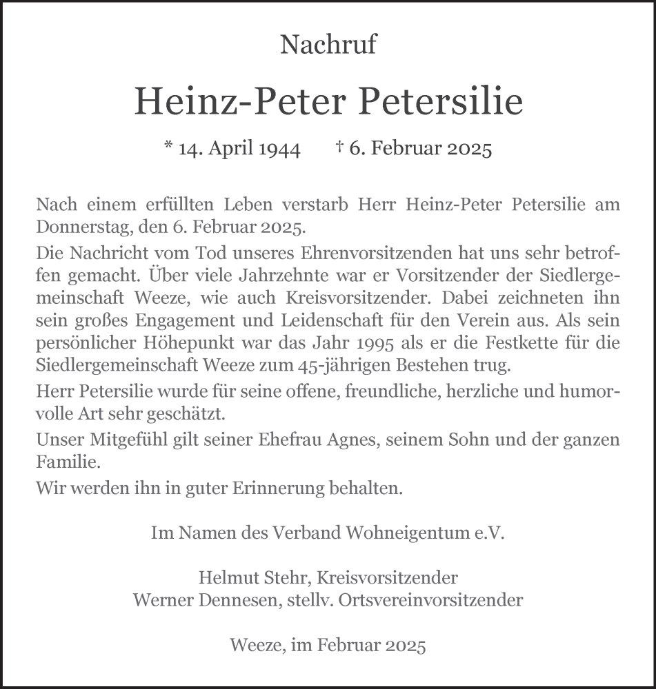Hier finden Sie alle Traueranzeigen aus der Zeitung, die bisher für Heinz-Peter Petersilie erschienen sind. Weitere Traueranzeigen, die in der Zeitung erscheinen, werden hier ebenfalls aufgelistet