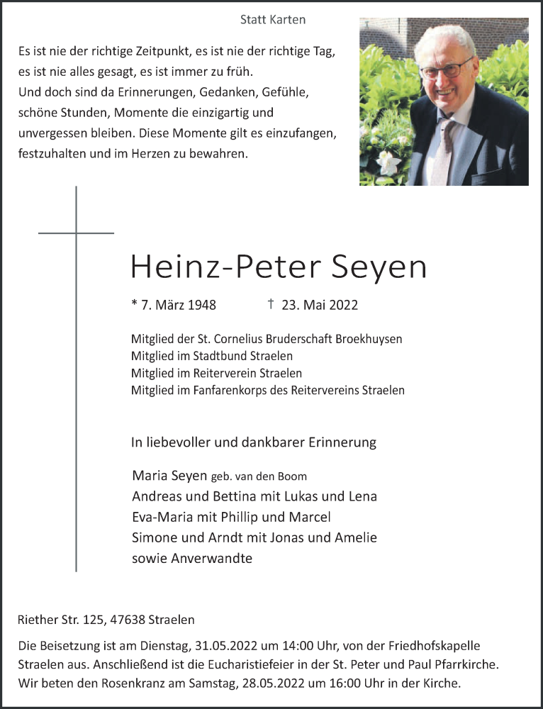 Hier finden Sie alle Traueranzeigen aus der Zeitung, die bisher für Heinz-Peter Seyen erschienen sind. Weitere Traueranzeigen, die in der Zeitung erscheinen, werden hier ebenfalls aufgelistet