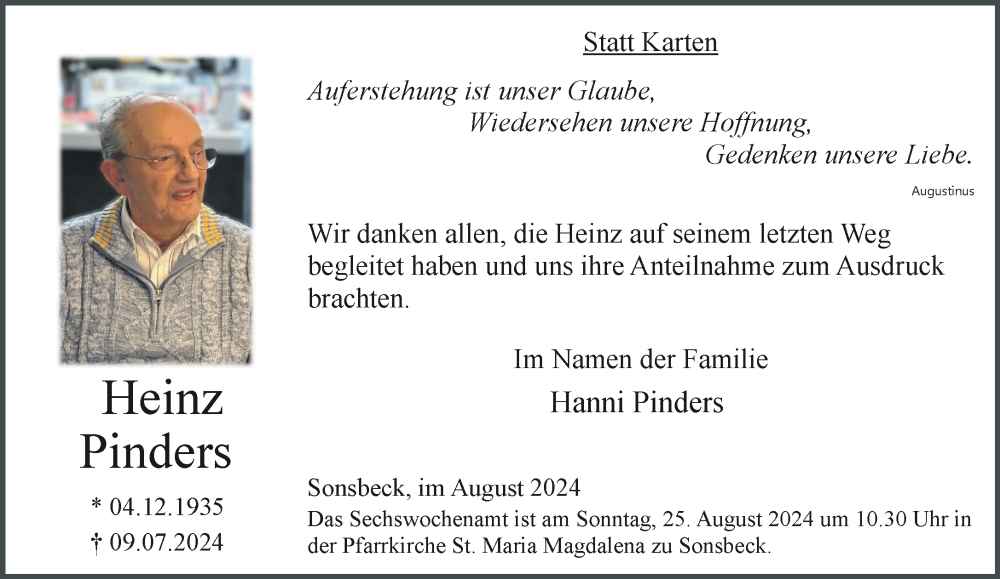 Hier finden Sie alle Traueranzeigen aus der Zeitung, die bisher für Heinz Pinders erschienen sind. Weitere Traueranzeigen, die in der Zeitung erscheinen, werden hier ebenfalls aufgelistet