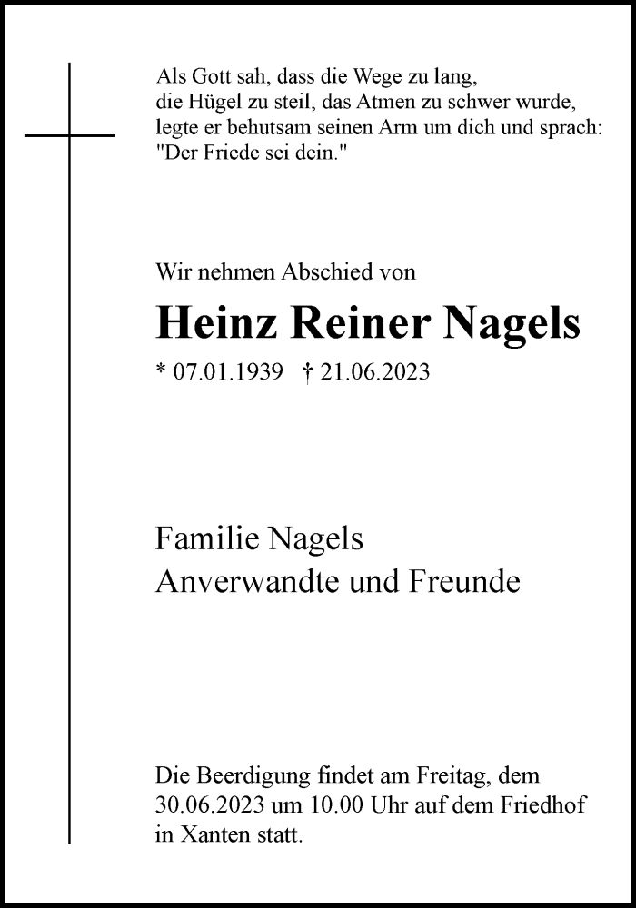 Hier finden Sie alle Traueranzeigen aus der Zeitung, die bisher für Heinz Reiner Nagels erschienen sind. Weitere Traueranzeigen, die in der Zeitung erscheinen, werden hier ebenfalls aufgelistet