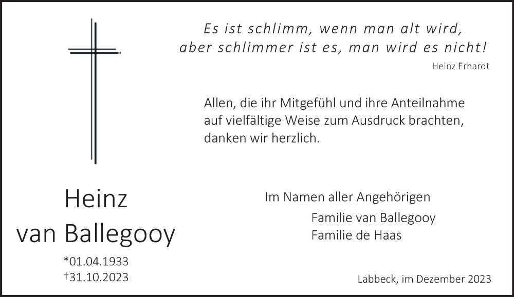 Hier finden Sie alle Traueranzeigen aus der Zeitung, die bisher für Heinz van Ballegooy erschienen sind. Weitere Traueranzeigen, die in der Zeitung erscheinen, werden hier ebenfalls aufgelistet