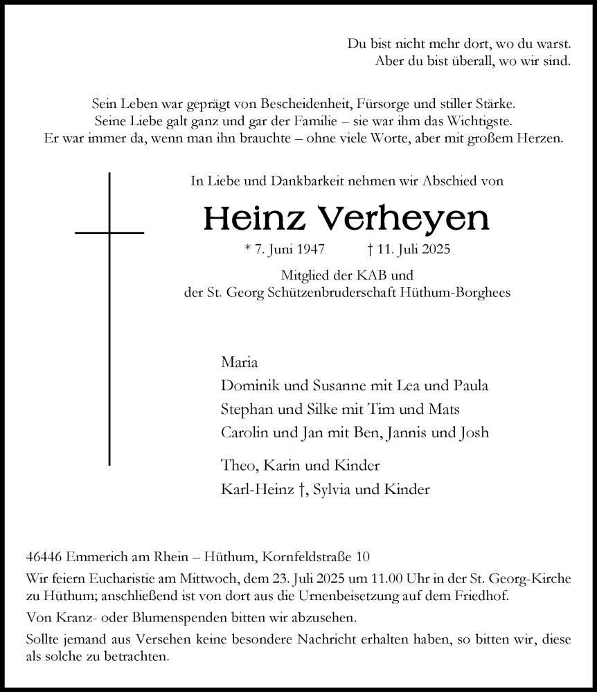 Hier finden Sie alle Traueranzeigen aus der Zeitung, die bisher für Heinz Verheyen erschienen sind. Weitere Traueranzeigen, die in der Zeitung erscheinen, werden hier ebenfalls aufgelistet