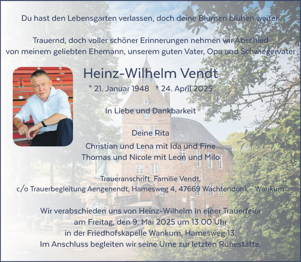 Hier finden Sie alle Traueranzeigen aus der Zeitung, die bisher für Heinz-Wilhelm Vendt erschienen sind. Weitere Traueranzeigen, die in der Zeitung erscheinen, werden hier ebenfalls aufgelistet