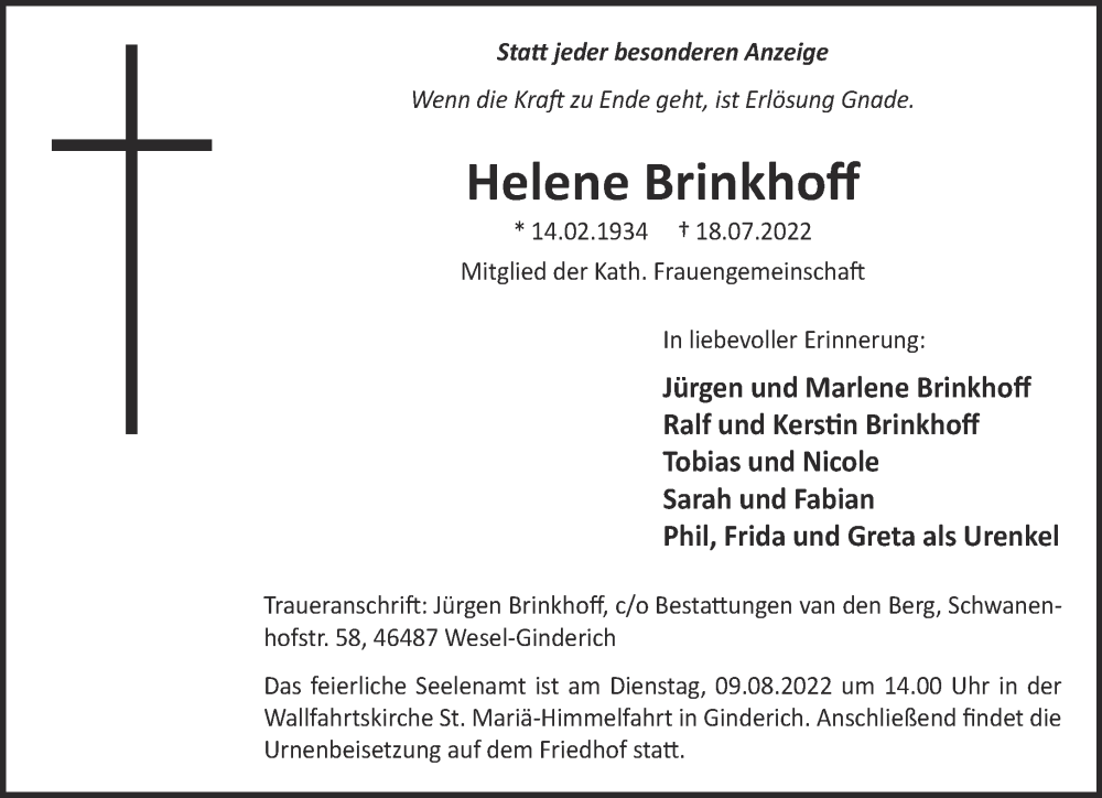 Hier finden Sie alle Traueranzeigen aus der Zeitung, die bisher für Helene Brinkhoff erschienen sind. Weitere Traueranzeigen, die in der Zeitung erscheinen, werden hier ebenfalls aufgelistet