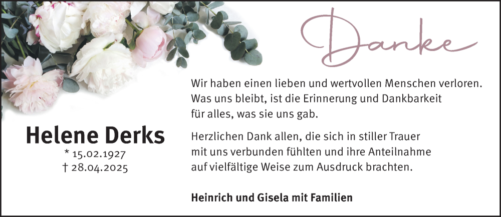 Hier finden Sie alle Traueranzeigen aus der Zeitung, die bisher für Helene Derks erschienen sind. Weitere Traueranzeigen, die in der Zeitung erscheinen, werden hier ebenfalls aufgelistet