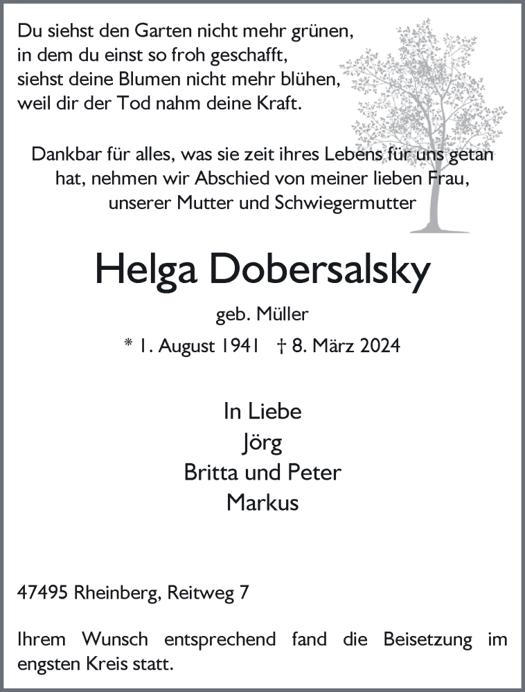 Hier finden Sie alle Traueranzeigen aus der Zeitung, die bisher für Helga Dobersalsky erschienen sind. Weitere Traueranzeigen, die in der Zeitung erscheinen, werden hier ebenfalls aufgelistet