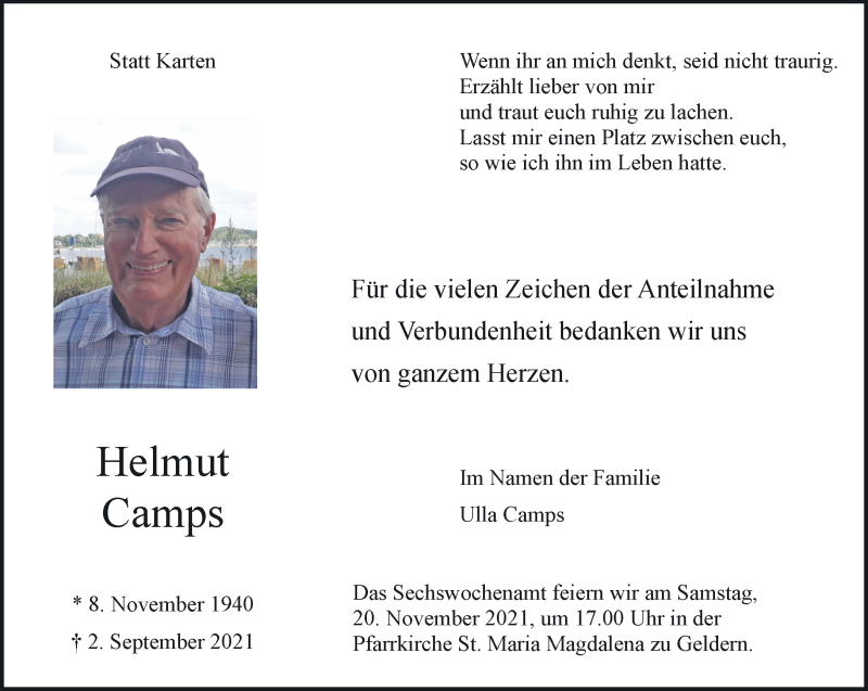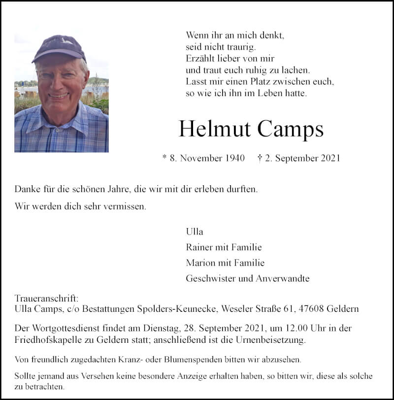 Hier finden Sie alle Traueranzeigen aus der Zeitung, die bisher für Helmut Camps erschienen sind. Weitere Traueranzeigen, die in der Zeitung erscheinen, werden hier ebenfalls aufgelistet
