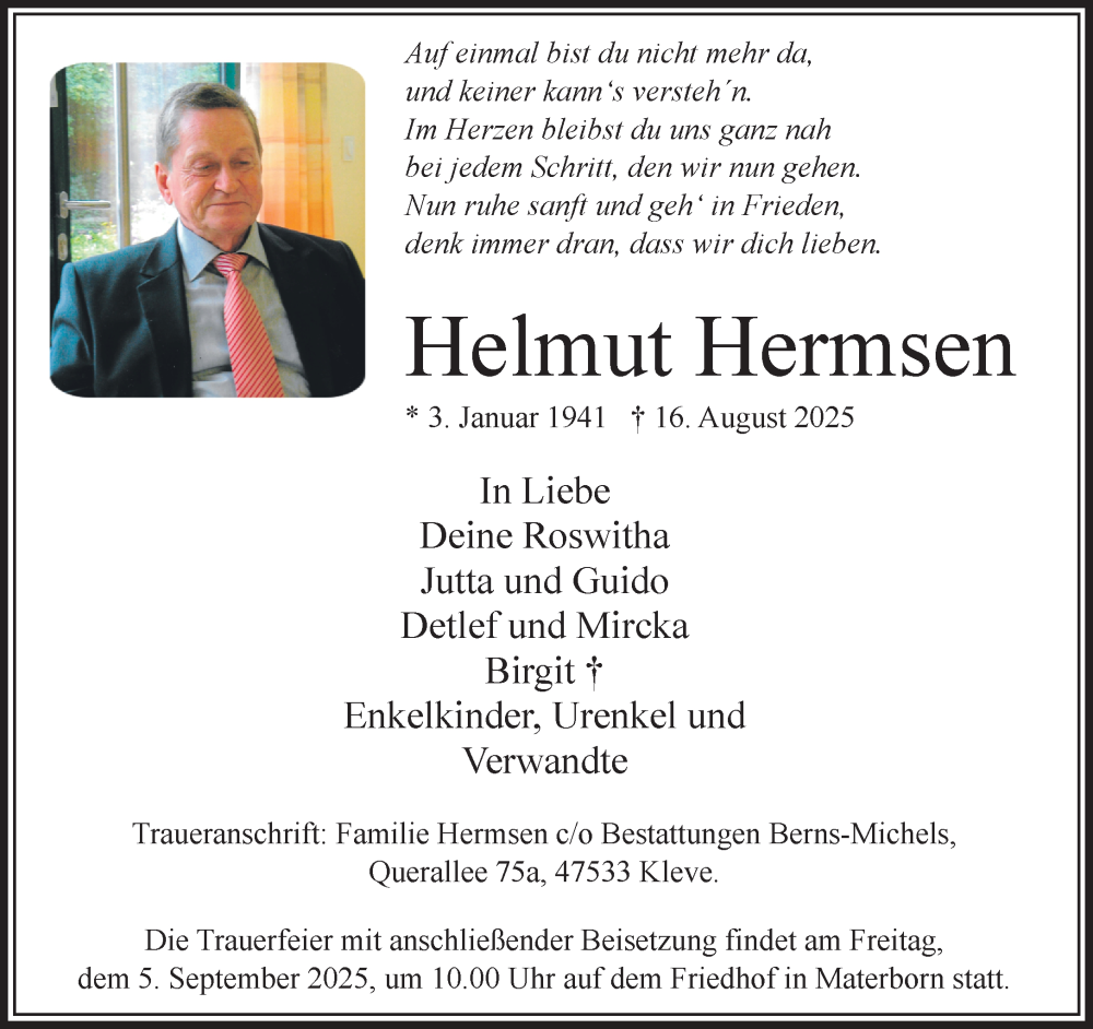 Hier finden Sie alle Traueranzeigen aus der Zeitung, die bisher für Helmut Hermsen erschienen sind. Weitere Traueranzeigen, die in der Zeitung erscheinen, werden hier ebenfalls aufgelistet