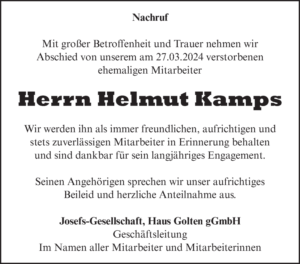 Hier finden Sie alle Traueranzeigen aus der Zeitung, die bisher für Helmut Kamps erschienen sind. Weitere Traueranzeigen, die in der Zeitung erscheinen, werden hier ebenfalls aufgelistet