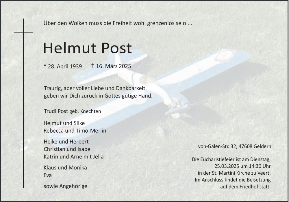 Hier finden Sie alle Traueranzeigen aus der Zeitung, die bisher für Helmut Post erschienen sind. Weitere Traueranzeigen, die in der Zeitung erscheinen, werden hier ebenfalls aufgelistet