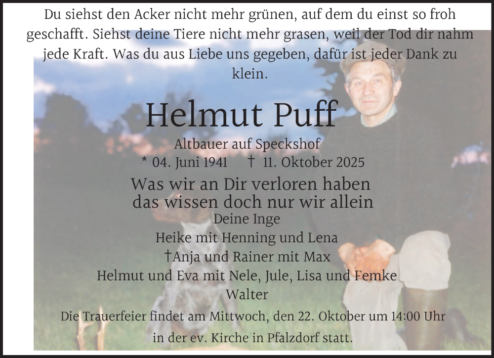 Hier finden Sie alle Traueranzeigen aus der Zeitung, die bisher für Helmut Puff erschienen sind. Weitere Traueranzeigen, die in der Zeitung erscheinen, werden hier ebenfalls aufgelistet