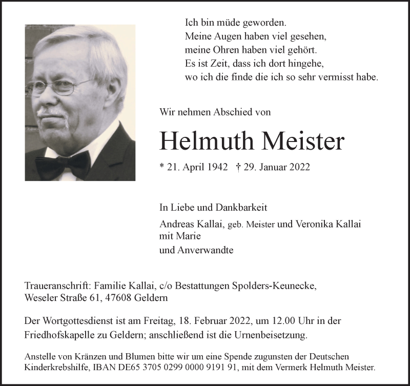 Hier finden Sie alle Traueranzeigen aus der Zeitung, die bisher für Helmuth Meister erschienen sind. Weitere Traueranzeigen, die in der Zeitung erscheinen, werden hier ebenfalls aufgelistet