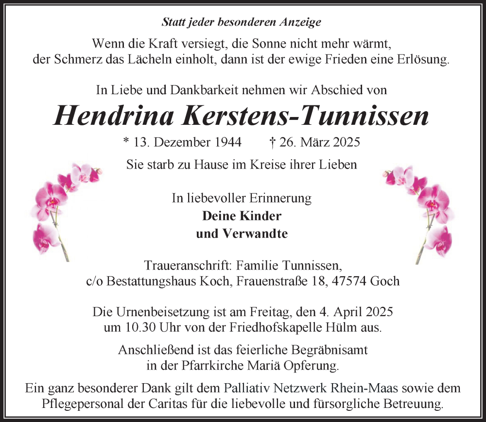 Hier finden Sie alle Traueranzeigen aus der Zeitung, die bisher für Hendrina Kerstens-Tunnissen erschienen sind. Weitere Traueranzeigen, die in der Zeitung erscheinen, werden hier ebenfalls aufgelistet