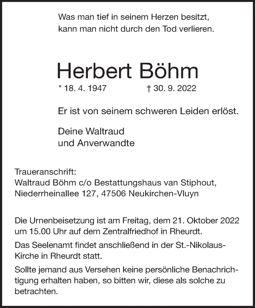Hier finden Sie alle Traueranzeigen aus der Zeitung, die bisher für Herbert Böhm erschienen sind. Weitere Traueranzeigen, die in der Zeitung erscheinen, werden hier ebenfalls aufgelistet