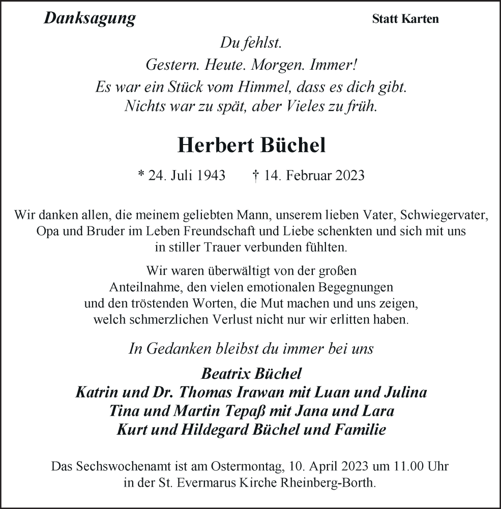 Hier finden Sie alle Traueranzeigen aus der Zeitung, die bisher für Herbert Büchel erschienen sind. Weitere Traueranzeigen, die in der Zeitung erscheinen, werden hier ebenfalls aufgelistet