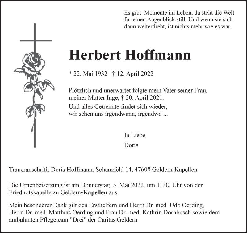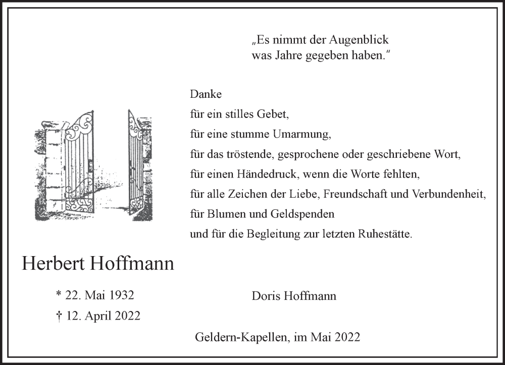 Hier finden Sie alle Traueranzeigen aus der Zeitung, die bisher für Herbert Hoffmann erschienen sind. Weitere Traueranzeigen, die in der Zeitung erscheinen, werden hier ebenfalls aufgelistet