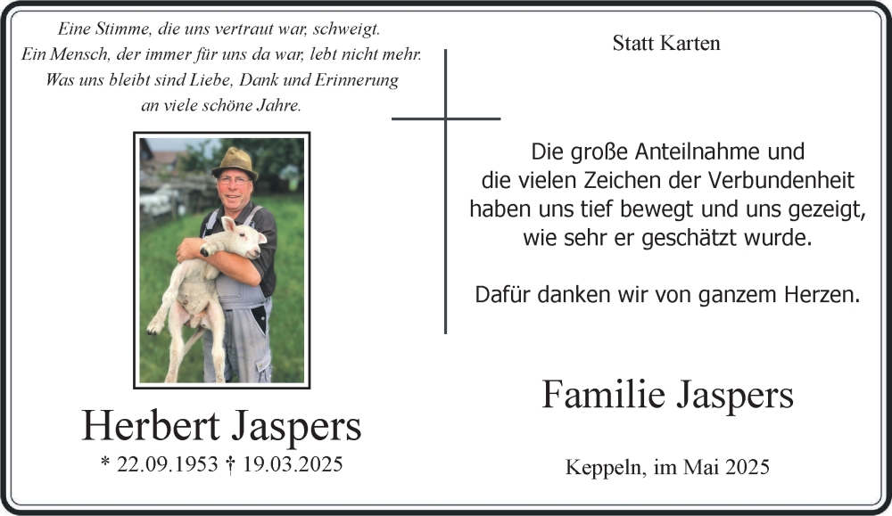 Hier finden Sie alle Traueranzeigen aus der Zeitung, die bisher für Herbert Jaspers erschienen sind. Weitere Traueranzeigen, die in der Zeitung erscheinen, werden hier ebenfalls aufgelistet