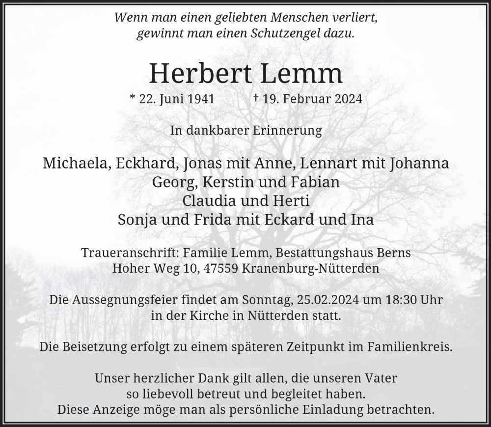 Hier finden Sie alle Traueranzeigen aus der Zeitung, die bisher für Herbert Lemm erschienen sind. Weitere Traueranzeigen, die in der Zeitung erscheinen, werden hier ebenfalls aufgelistet